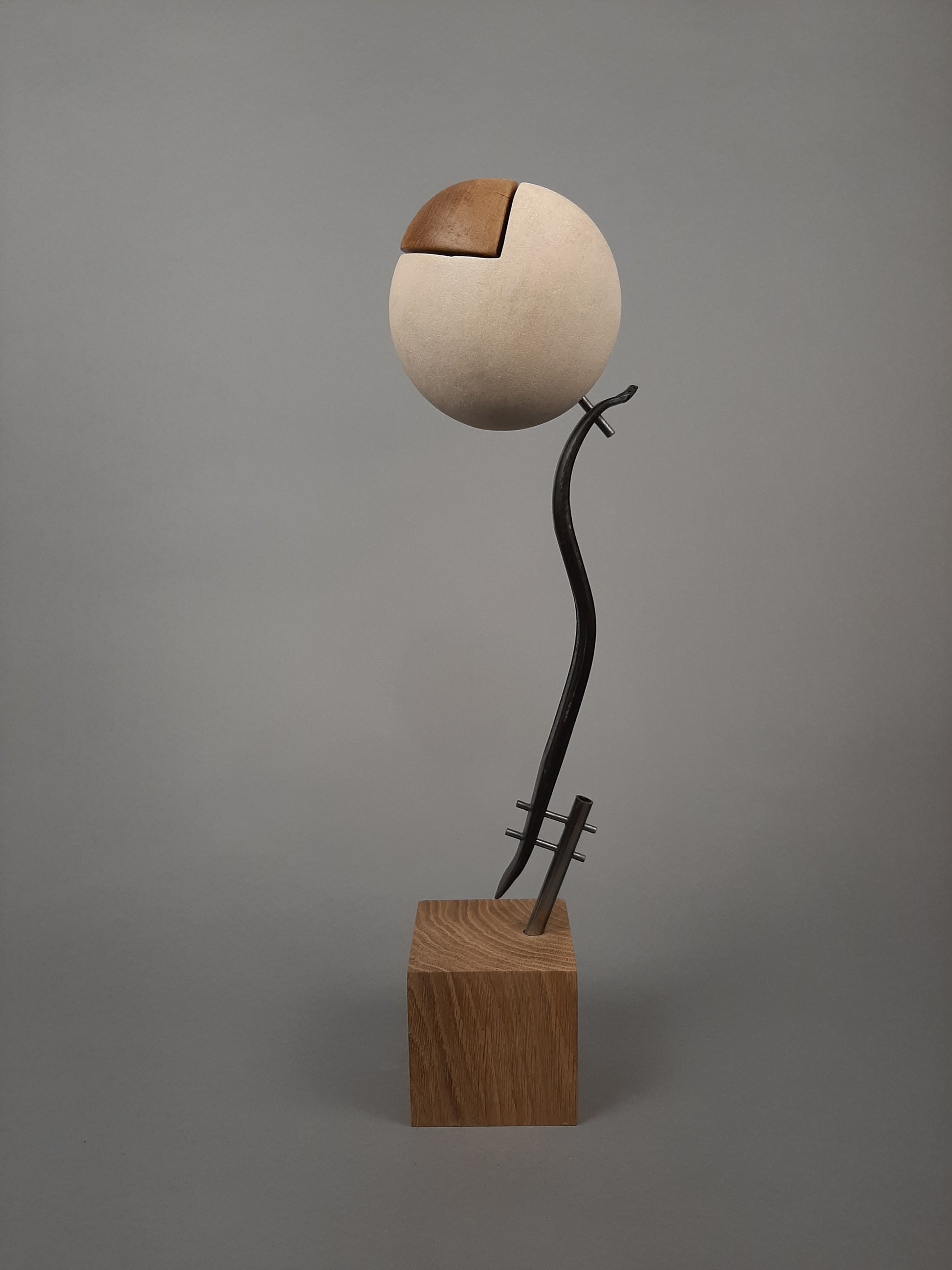 D’une élégance poétique, En passant, sur le pont des Arts évoque une traversée aérienne, presque suspendue. La sphère en pierre, fragmentée par une pièce de bois sculptée, semble flotter comme une pensée ou une émotion fugace.