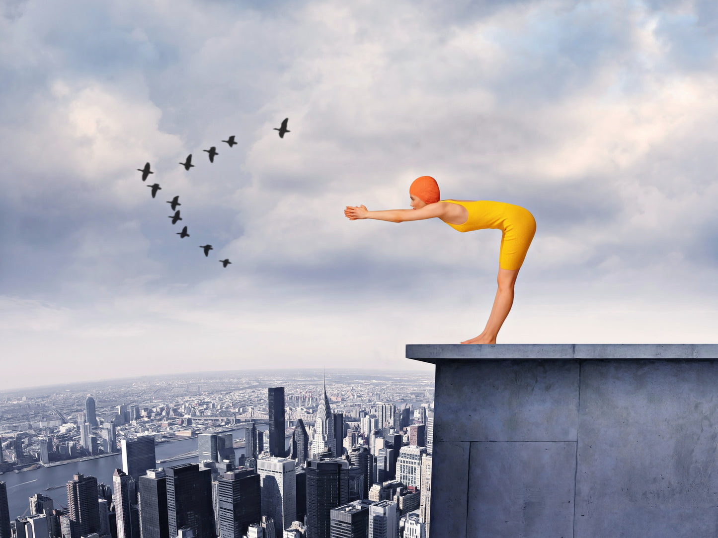 Perchée sur le rebord vertigineux d’un gratte-ciel, une femme en tenue de plongeuse s’apprête à s’élancer dans le vide. Face à elle, une volée d’oiseaux s’élève librement dans le ciel, lui traçant un chemin imaginaire. Le contraste saisissant entre la rigueur architecturale de la ville et l’élan poétique de l’instant crée une tension entre vertige, liberté et foi en l’inconnu.