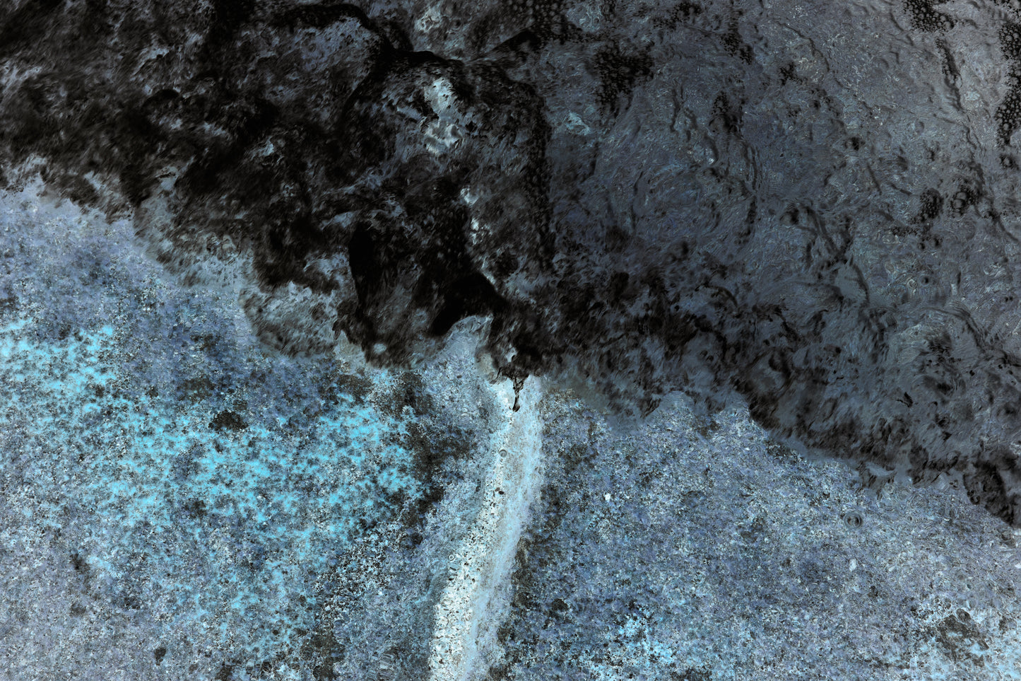Dans cette œuvre photographique issue de la série Losing turquoise, Ioustini Drakoulakou scrute les profondeurs texturales de la roche. Les noirs denses et les bleus cendrés évoquent autant la terre que les abysses, les origines telluriques autant que les spectres d’un monde en mutation. L’apparition discrète d’un turquoise lointain devient une trace de ce qui fut : minéral, symbole, croyance.
