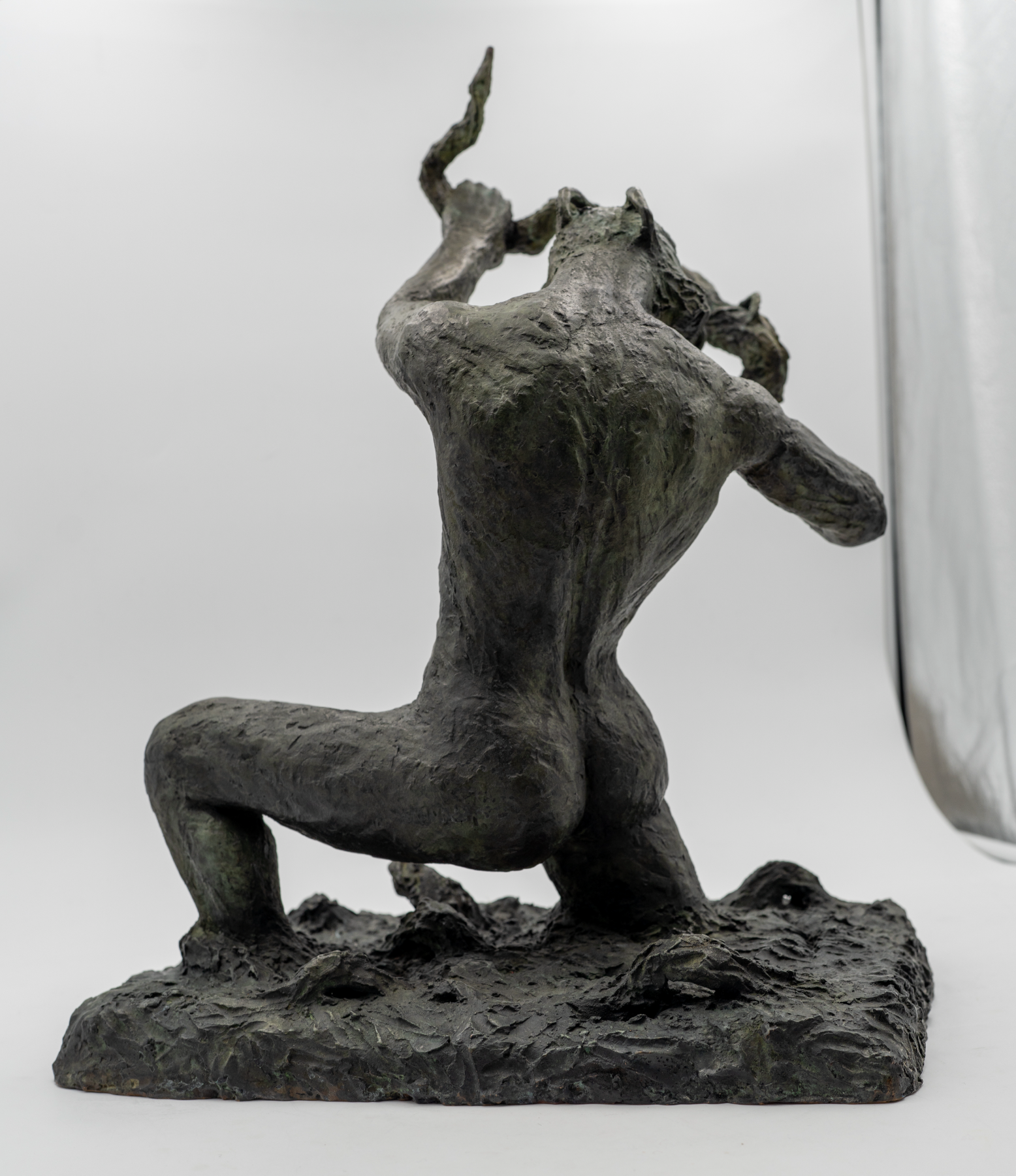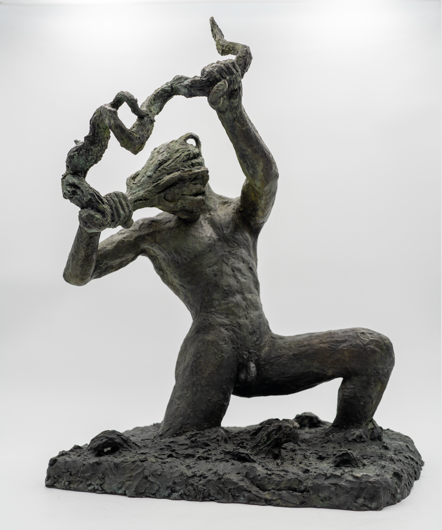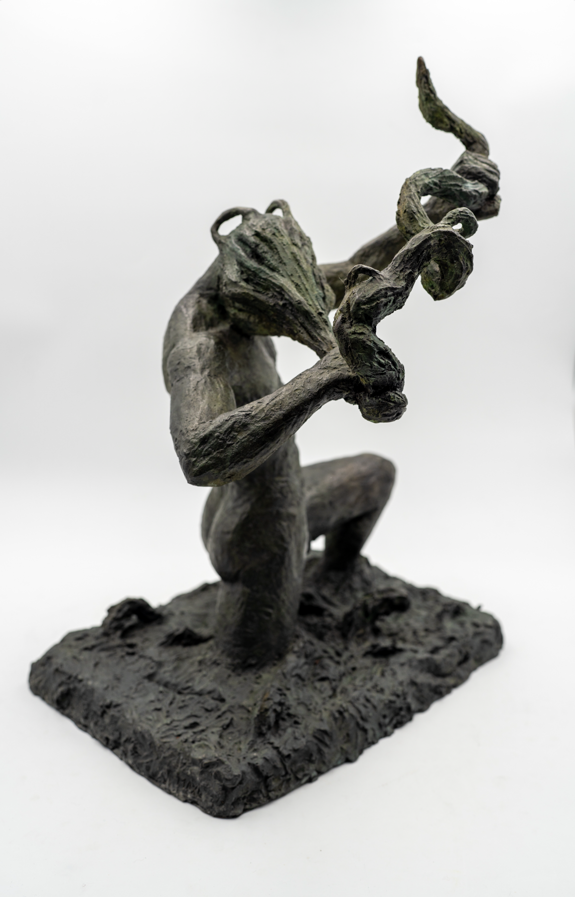 La texture brute et rugueuse du bronze renforce la sensation d’étouffement et de résistance ; chaque détail de la surface évoque ce chaos intérieur, cette matière lourde que l’on porte en soi. Les bras levés, le torse incliné, le personnage exprime à la fois l’effort extrême du soulèvement et l’espoir d’une révélation.