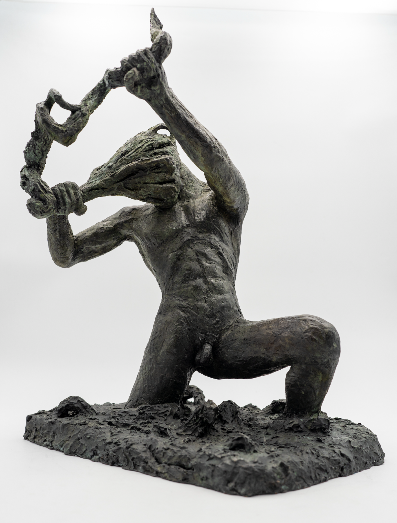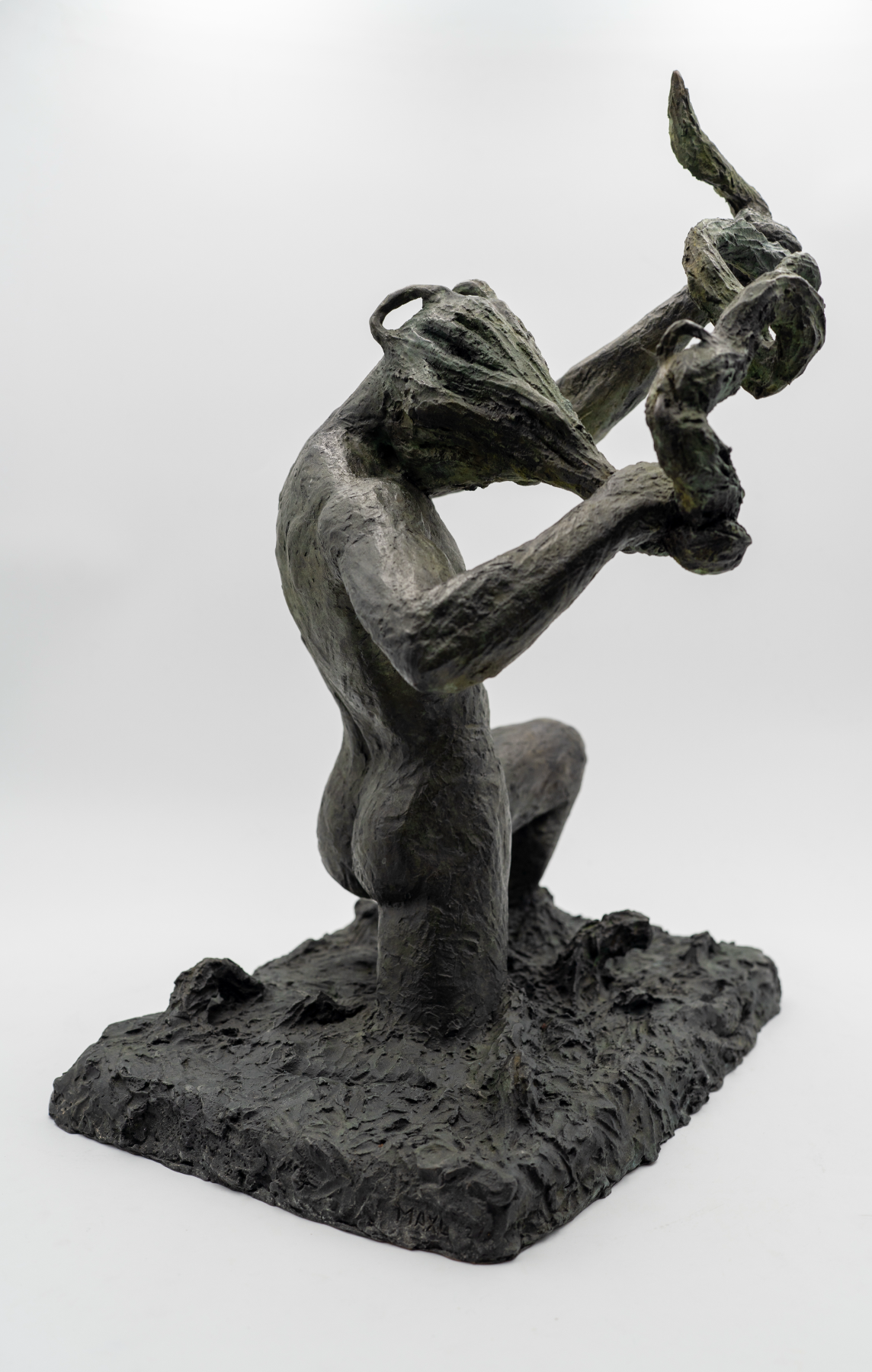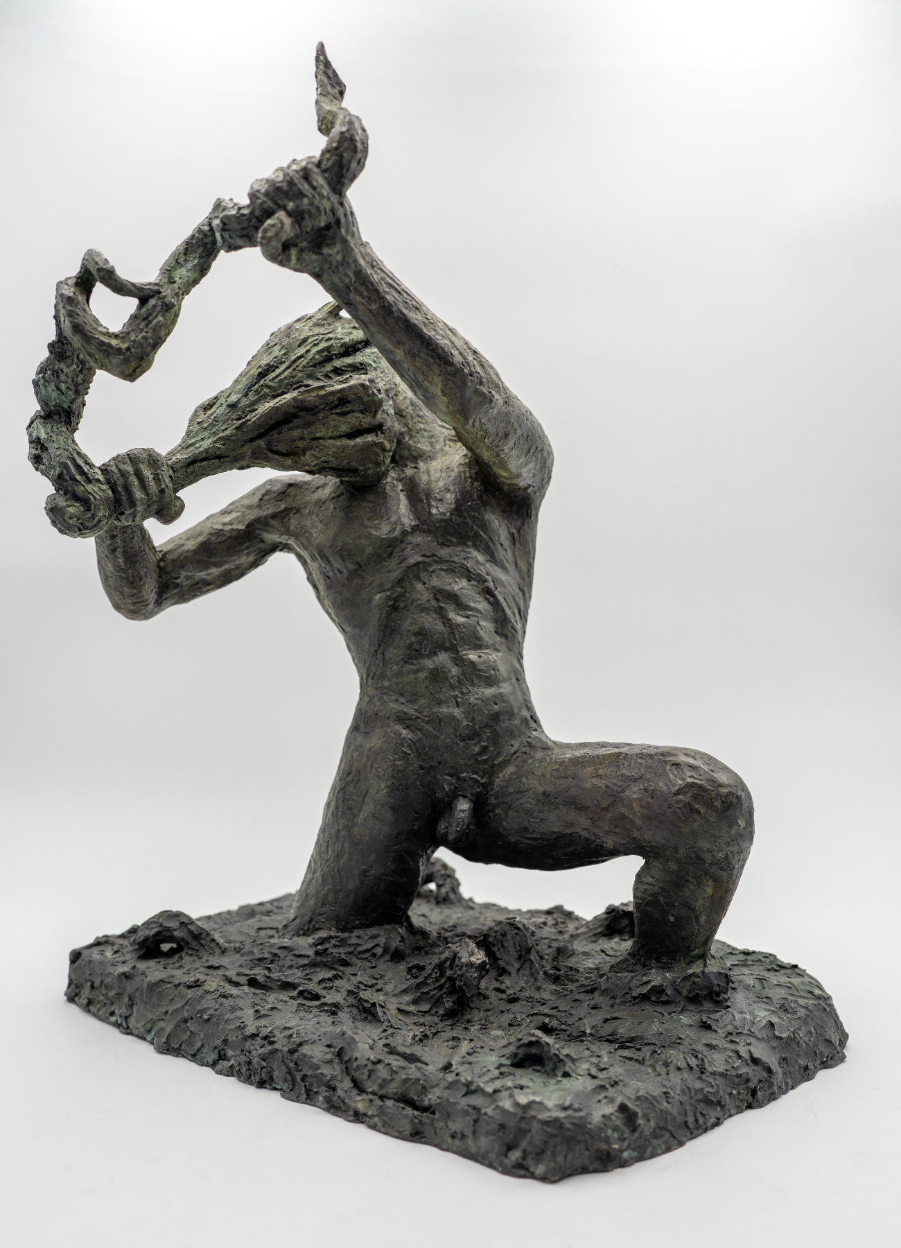 La texture brute et rugueuse du bronze renforce la sensation d’étouffement et de résistance ; chaque détail de la surface évoque ce chaos intérieur, cette matière lourde que l’on porte en soi. Les bras levés, le torse incliné, le personnage exprime à la fois l’effort extrême du soulèvement et l’espoir d’une révélation.