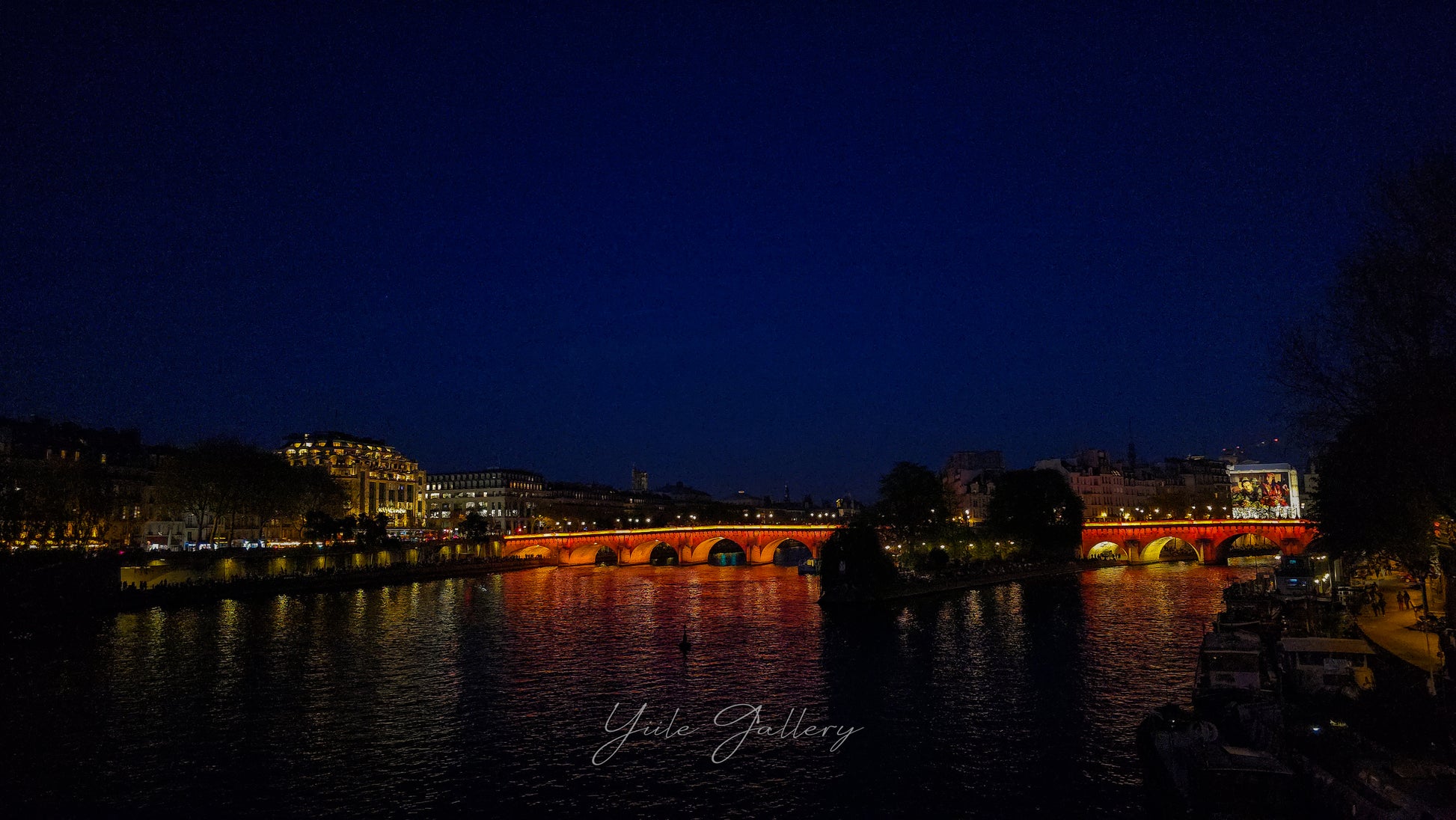 Avec Ville de Lumière, Vanessa Yiile propose une vision nocturne de la ville comme espace intérieur autant que paysage urbain. La scène s’ouvre sur un fleuve calme, miroir mouvant des lumières qui l’entourent. Les ponts s’illuminent d’un rouge chaleureux, tandis que les rives vibrent d’éclats dorés, dessinant une ligne de vie au cœur de l’obscurité.