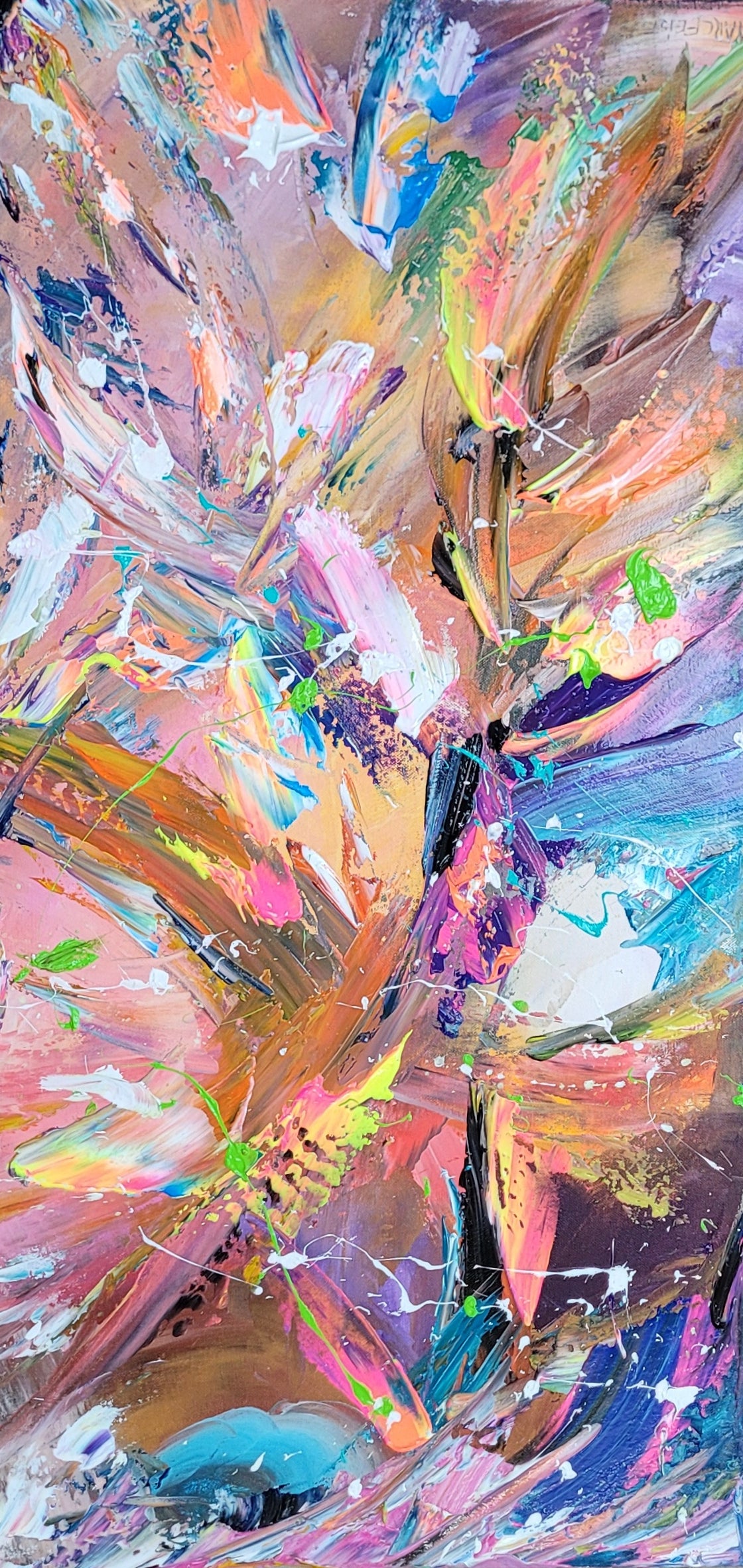 Les textures, sculptées au couteau, amplifient le relief et donnent une sensation de mouvement ascensionnel. La composition semble vibrer, danser, rugir, comme si la nature exprimait sa colère ou sa renaissance.