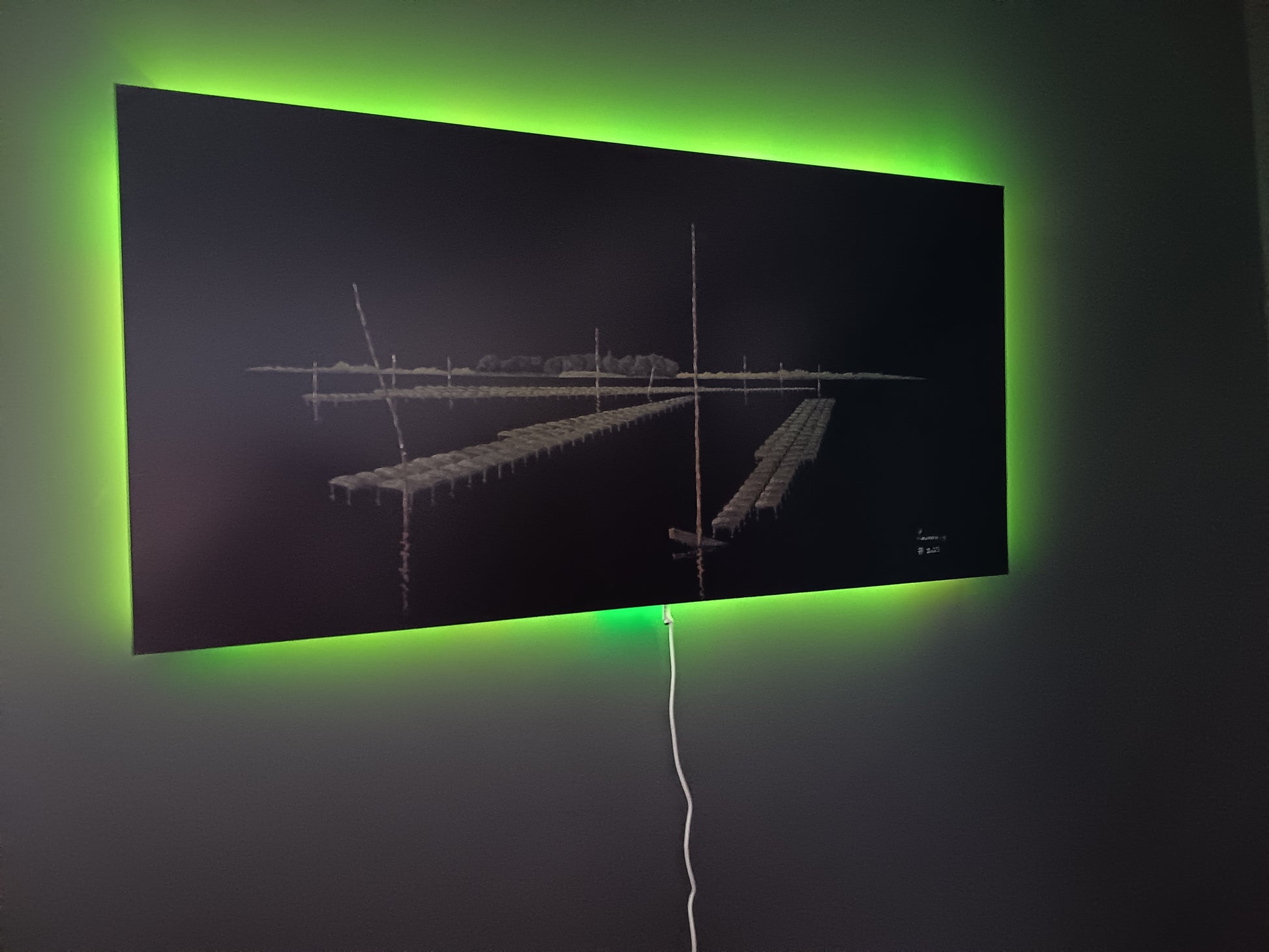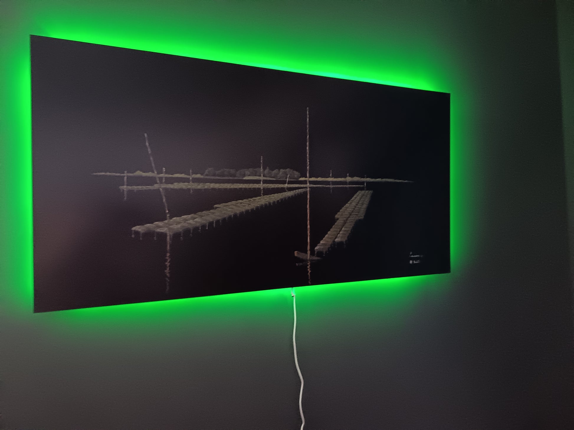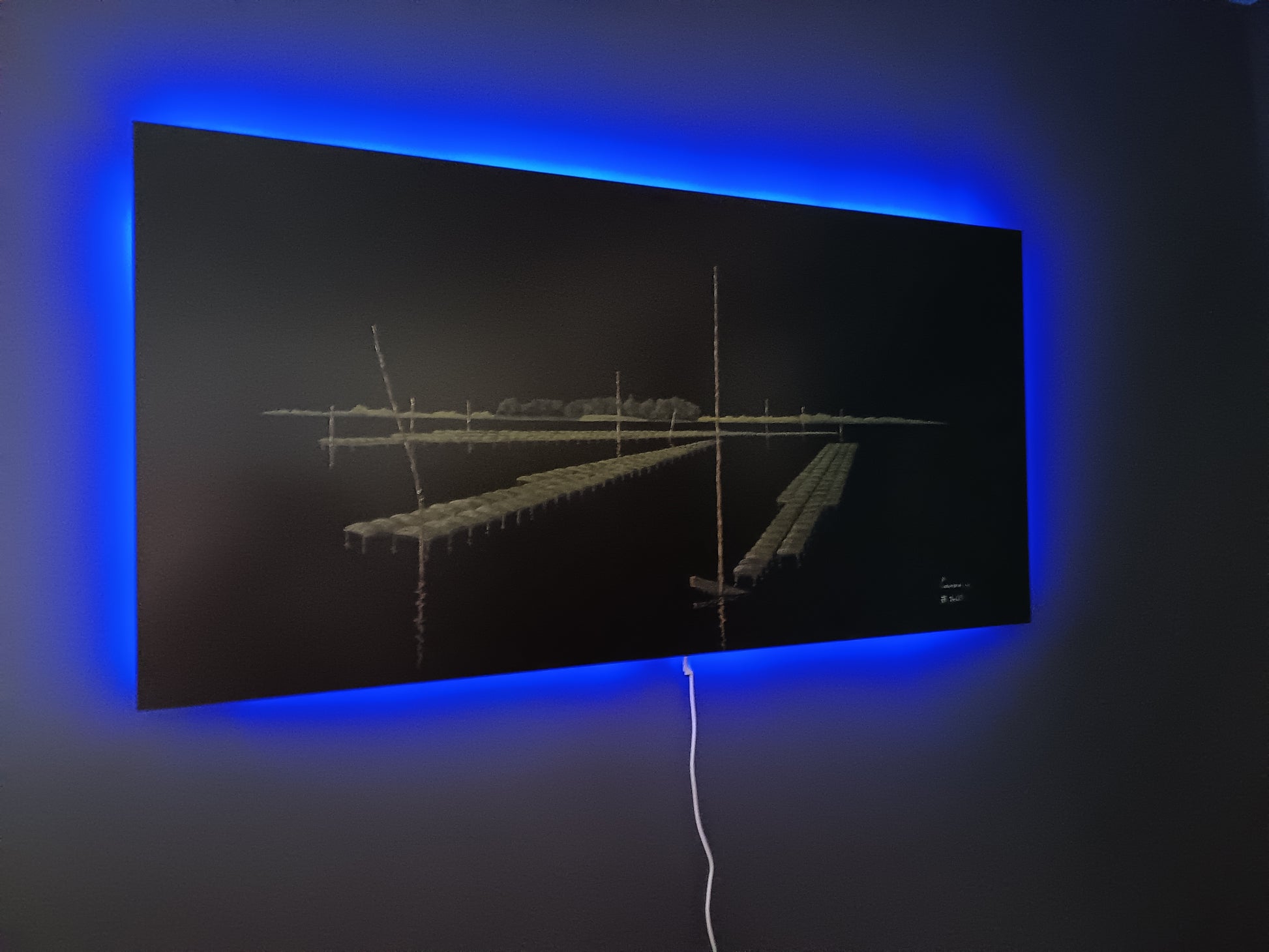 Ce qui rend cette œuvre véritablement unique est son rétroéclairage intégré, modulable par télécommande. Le spectateur peut choisir la teinte de son ambiance — bleu, rouge, vert… — offrant à la scène une expérience vivante, presque méditative. La lumière semble émerger du paysage lui-même, comme si l'île Berder respirait dans l’obscurité.